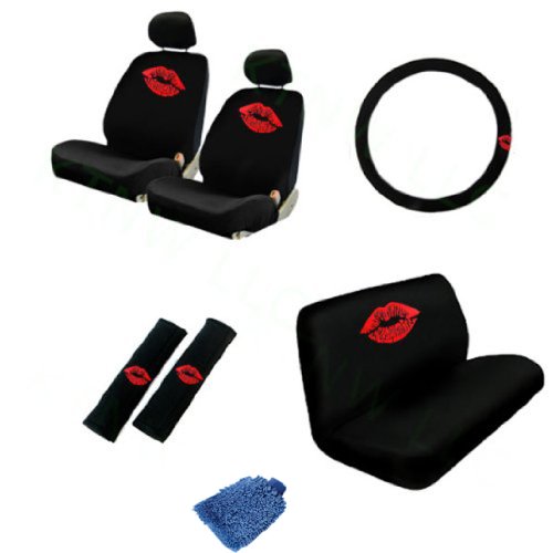 Exclusively from Unique Imports, This Red Hot Lips seat cover Set features innovative Material and design for both fashion and fit. This seat cover updates the appearance of old or dirty seats and protects against splits, stains, fading, dirt, and pet hairs. This full set is easy to install and fits almost all vehicles from compact to full size. Includes Bonus Steering wheel and Shoulder pads for those hot and cold days! & BONUS DETAILING WASH MITT & AIR FRESHENER
