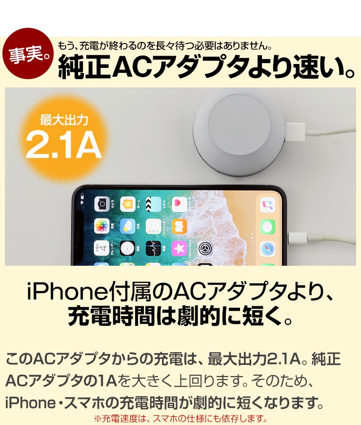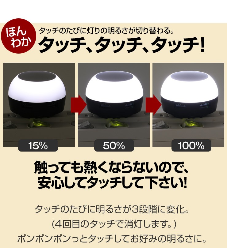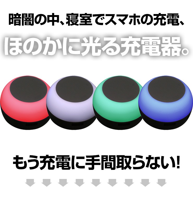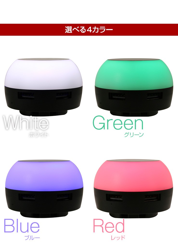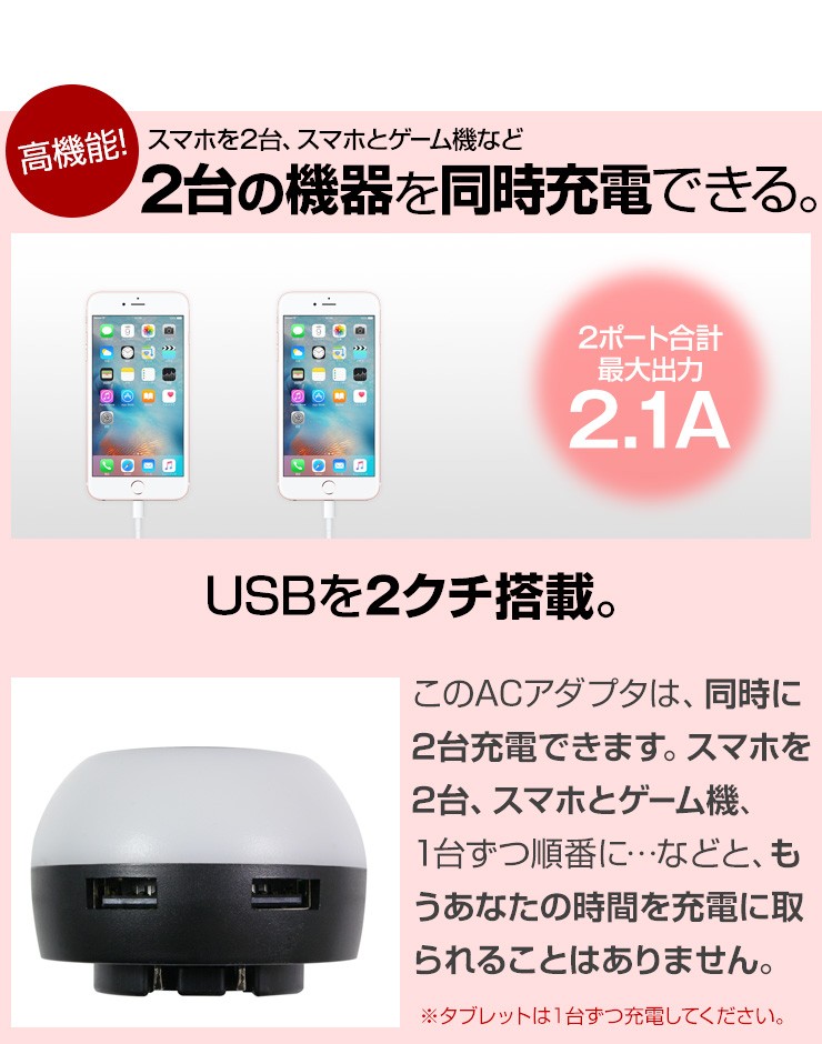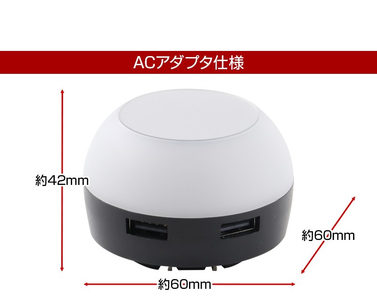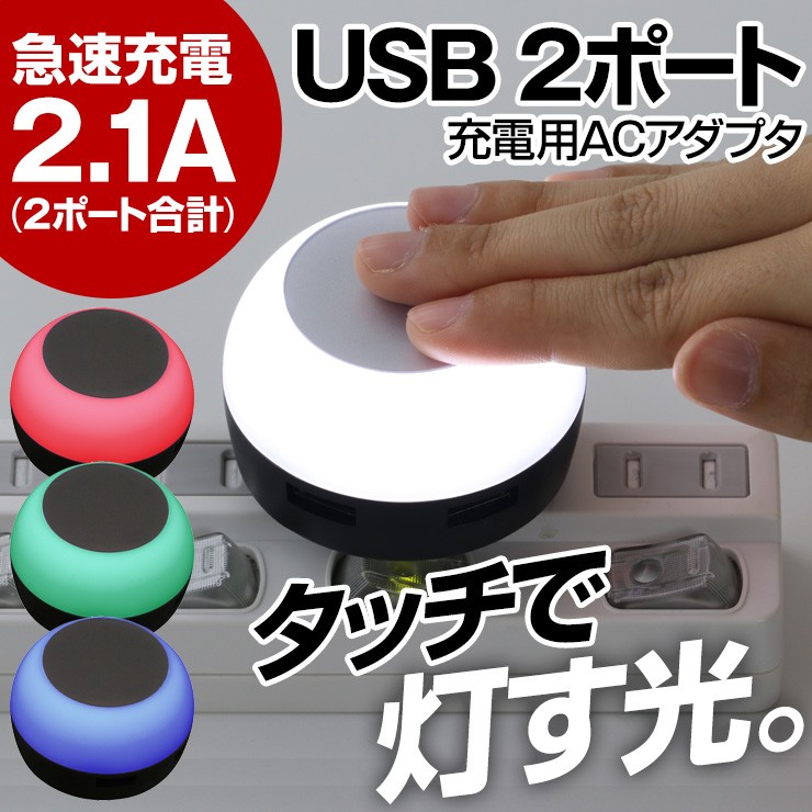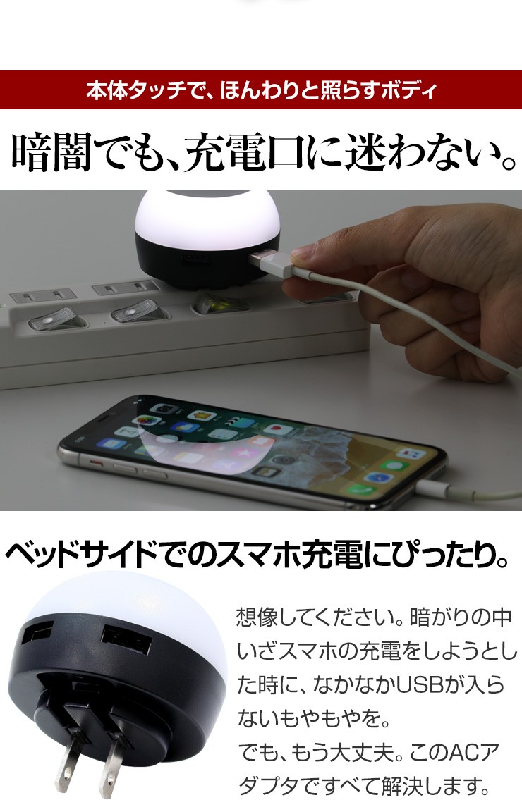 暗がりでもUSB充電ができる!タッチでほのかに光るACアダプタ【特徴】●本体上部をポンっとタッチする事によってライトアップする簡易照明にもなるAC充電器です。●光を付けながら充電する事ができるので、暗い所でも手元が照らせて便利です。●3段階に光が変化するので、お好みの明るさで光を楽しむ事ができます。●触っても熱くなく安心のLEDライトを使用しているので、照射面に触れても熱くないので、タッチ操作を行う際も安心して操作する事ができます。●90度回転式折りたたみコンセント用プラグを使用しているので、使わない時はプラグをコンパクトに収納できます。●出力合計2.1AのUSBポートが2口搭載しているので、2台同時充電が可能です。デジキン