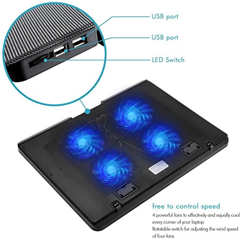 -. Feature : LIGHTWEIGHT&HIGH QUALITY, it is perfect size and easy carries out; you can get good significant cooler effect with very quick cooler speed. Designed with on/off button and the speed of fans could be adjusted. / ADJUSTABLE ANGLE: This notebook cooler fan designed with unique lean adjustment and comfortable elevation-angle, it could be adjusted to different height to meet any of your needs. / MUTE MODEL AND EFFICIENT: Super amazing laptop cooling fans with large meshes, using mute fans and come with 2 USB ports, it is minimal but not simplify. / SECURITY: Using special anti-skid pad to ensure the use of safety, make it more security and more convenience. / SUPPORT DIFFERENT SIZES: It more suitable for large size notebook, support 12-17 inches, we can also provide 12 months warranty and 2 months hassle-free return policy.