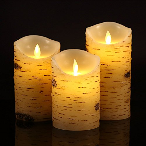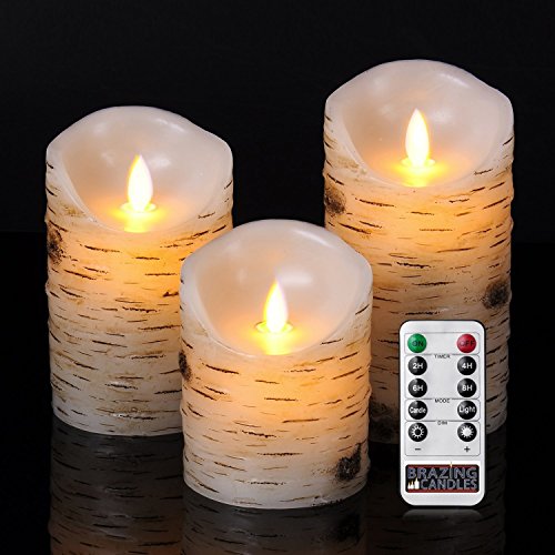 BRAZING CANDLES , 3 pc LED Candle Set, Birch, 3 inch diam, remote control 3PC 3.15"x4"/5"/6High, ,Moving flame, Birch bark effect Birch wood,w/10 key remote control