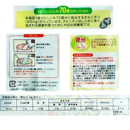 鉄分1日必要量の1/2が含まれます:しじみのうまみに、ほたて、昆布などのコクがとけ込んだ風味豊かなスープです。