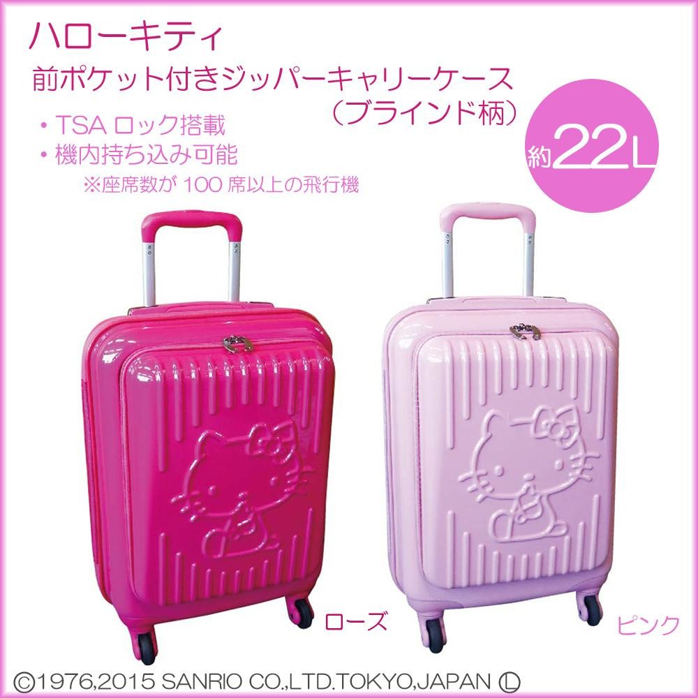 | 内側生地もキティ柄の可愛いキャリーケースです。気軽に荷物の出し入れができる、便利なポケット付き♪キャスターは移動しやすい360度回転式の4輪タイプ、TSAロック搭載、座席数100以上の飛行機持ちこみ可能サイズです。 |