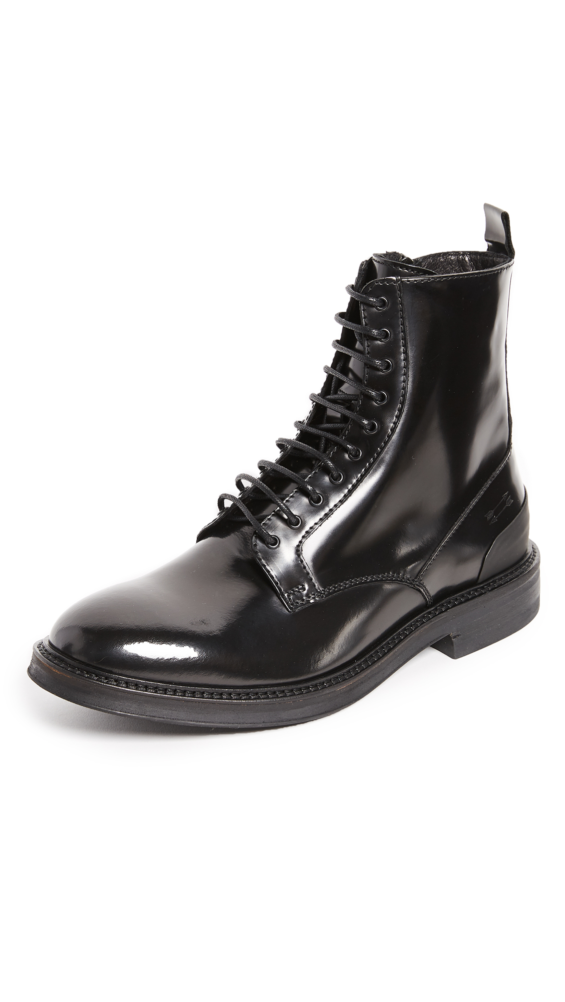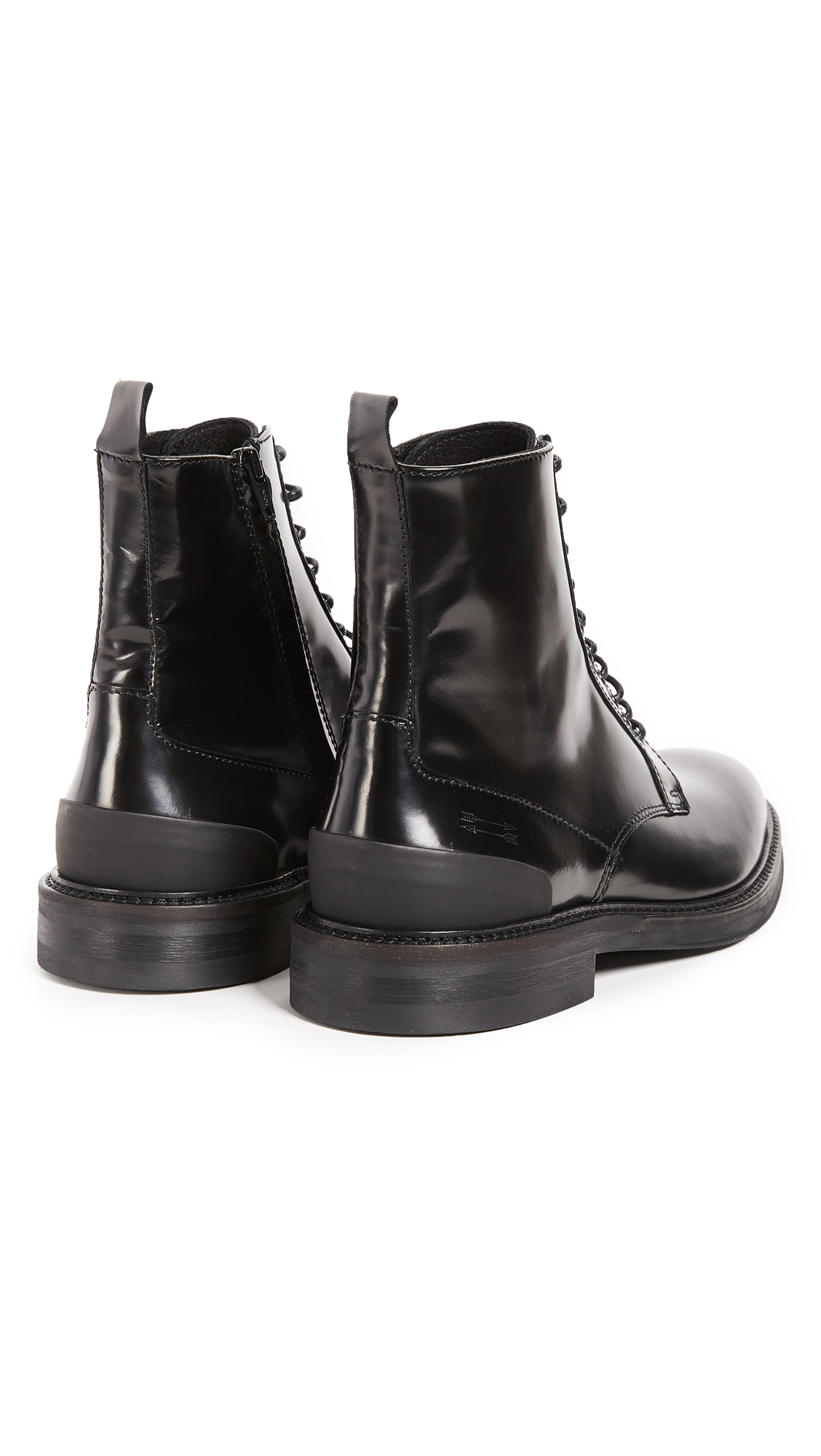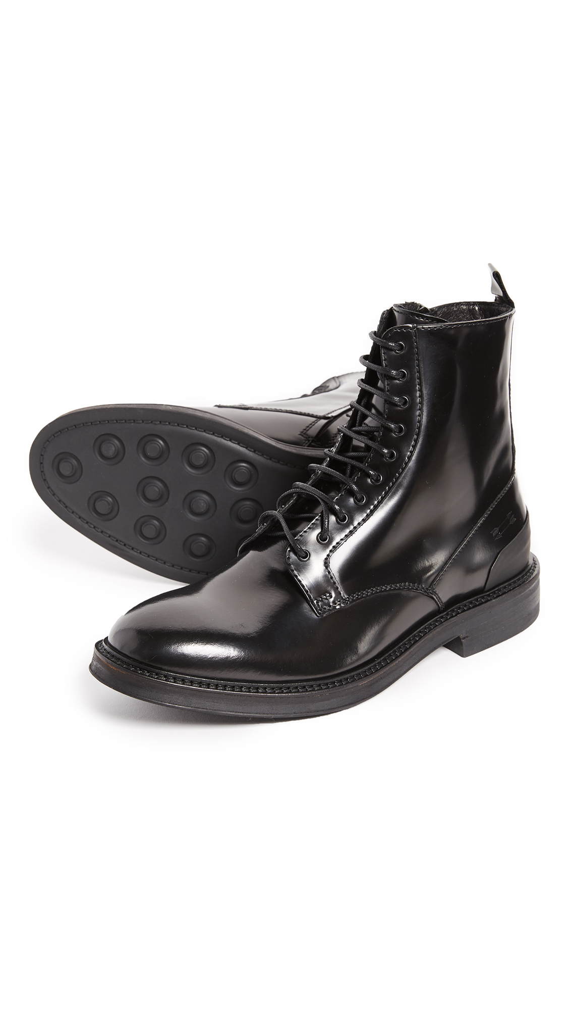 Polished leather Uri Minkoff boots with a classic combat profile. Waxed laces over the tongue. Side zip. Rubber heel guard. Welted to a split rubber grip sole.