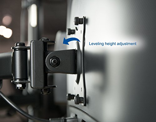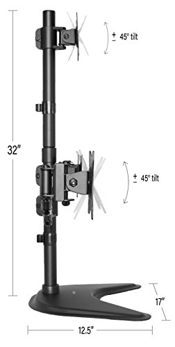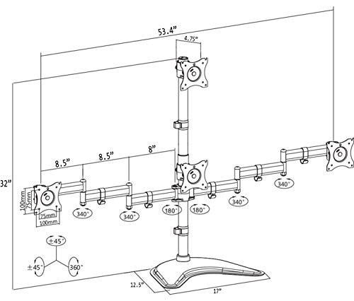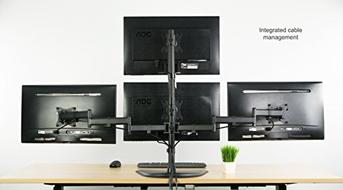 -. Feature : COMPATIBILITY - Holds Four Screens up to 24" and 17.6 lbs each with VESA 75x75mm & 100x100mm mounting holes (will fit 27" screens but will allow very limited angled screen positioning) / MOTION - +45 degree to -45 degree tilt, 360 degree swivel, 360 degree rotation, and height adjustability for optimal viewing angles / CABLE MANAGEMENT - System integrated in order to keep potentially messy cords clean and organized / STABILITY - High Grade Steel and Aluminum, Heavy Duty 4" C-clamp, and an optional grommet mounting to suit your installation requirements / DIMENSIONS - Center Post height measures 32". The distance between the two outside mounting brackets measures 53" when full extended.