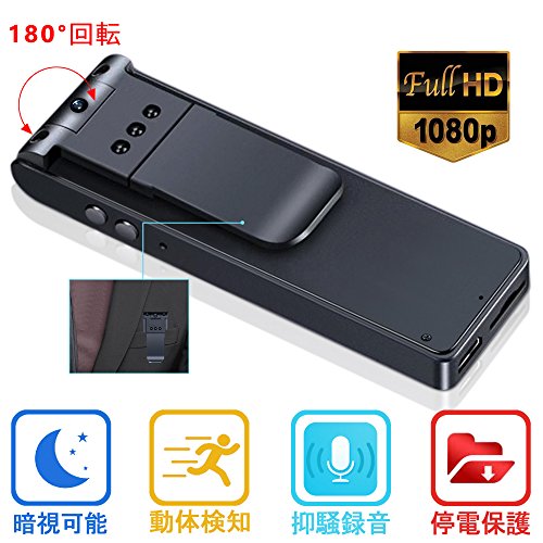 -. Feature : •【高画質、高音質】小型カメラは1920X1080Pハイビジョン撮影に問わず、内部が優質なチップを採用し、本来の音を間引くことなくそのまま録音することができます。授業、会議、商談などの臨場感も伝わりやすくなり、ボイスレコーダーとしても利用できます。 カードを取り外したら、ウェブカメラとしても活用します。 / •【大容量&録画モード選択でき】この大容量録画カメラは128GBカード(別売)対応可能、容量不足の問題を解決。録画モードは普通録画/循環録画二つが選択できます。循環モードで、Micro SDカードがいっぱいであっても最も古いファイルを上書きして録画を続行し、メモリカード容量不足が心配ありません。 / •【暗視機能&180度回転レンズ】赤外線LEDライト付き小型カメラは、夜でもちゃんと録画できます。180度回転レンズ搭載し、ポケットに設置して、使用しないときは自分側に回る、使用する時はそと側に回る、誰もが小型カメラとは思いません。 / •【操作簡単&小型】ワンタッチで撮影/録音/自動保存、とても簡単に操作できます。小型カメラなので、持ち歩きやすくて、軽薄で、裏クリップで持つ、ポケット或いは衿に挟んで撮影と録音をすることができます。 / •【停電保護&安心】小型録音カメラが電力不足とき、先に録画録音を保存してあとオフします。大事なファイルが無くす心配がありません。また、1年保証付き、通常使用で万が一不具合がございましたら、ご購入時から1年以内であれば、無償で交換などが致します。
