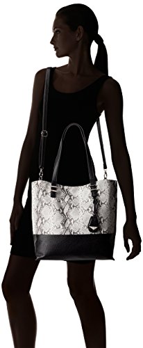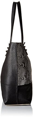 A PVC two- tone double sided tote with removable zip pouch. Comes with removable, adjustable cross body strap and metal hardware feet