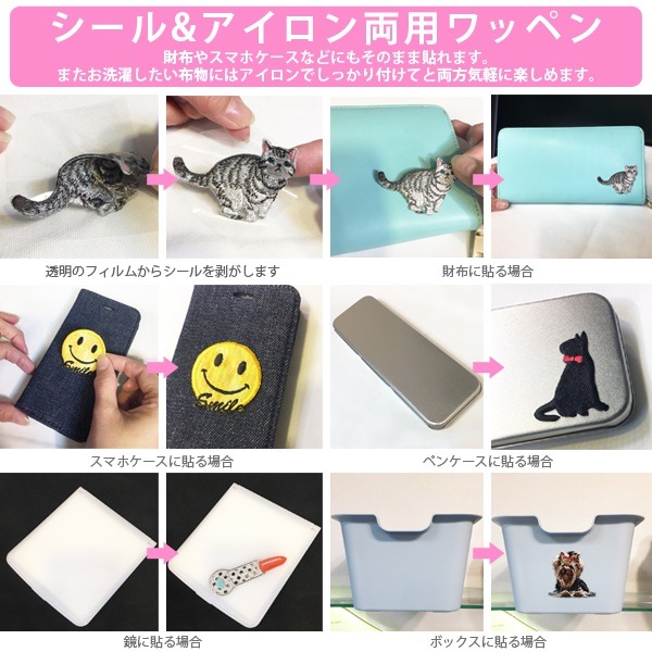 | 商品詳細 | こちらのワッペンはシールになっているので、 ノートやファイル、アルバムなどにもそのまま貼れます。 また、お洗濯したい布モノにはアイロンでしっかり付けてと 両方気軽に楽しめます! ワッペンをバッグやポーチ、などに貼り付けて 自分だけのオリジナルデザインを作り出すことができます! アイロンで貼り付け可能!もちろん接着剤での貼り付けも可能! 簡単にリメイクすることができちゃいます。 |