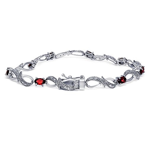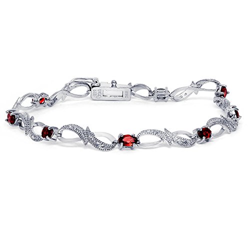 This elegant bracelet features eight oval garnet stones set in prongs between Sterling Silver infinity designs. There is a small, genuine diamond (less than 17 facets) set centrally of the bracelet.