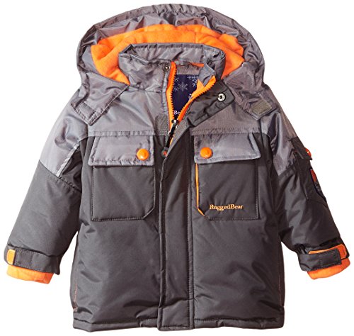 Color-blocked cold-weather jacket featuring polar fleece lining, snap-close storm gator closure at inside waist, and hood with hook-and-loop face shield