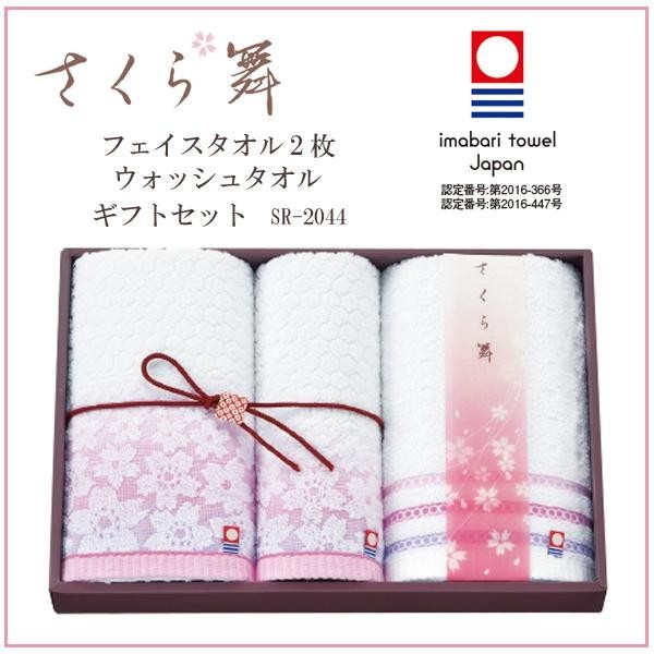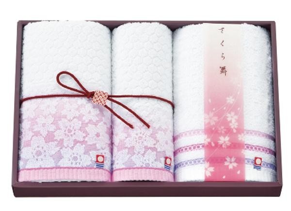 風に舞う桜の様子を華やかな色と幾何学文様で構成したデザインでまとめ上げたタオルです。 製造国:日本 素材・材質:綿100% 仕様:洗濯機使用可 セット内容:フェイスタオル(約34×75cm)×2ウォッシュタオル(約34×35cm)×1 ※サプライヤー直送品 ご注文後7~8営業日後の出荷となります【商品名】さくら舞 今治 フェイスタオル2枚 ウォッシュタオル ギフトセット SR-2044