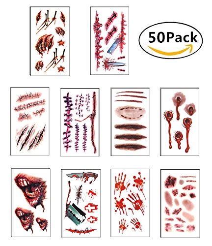 -. Title : 50+ Halloween Temporary Tattoos Sticker, Magnolora 50 Sheet Waterproof Horror Fake Bloody Wound Stitch Scar Scab Body Art Removable Tattoos Sticker for Parties, Masquerade, Cos Play, Prank