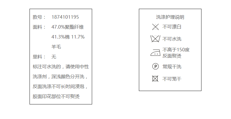 47.0%聚酯纤维 41.3%棉 11.7%羊毛