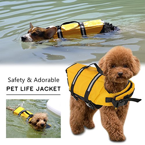 -. Feature : ✔The pet Life Jacket provide ultimate buoyancy and high visibility to keep pets safe in or around the water,this life jacket can be a clothes, with reflective strip, even at night can also walking safety. / ✔Lightweight pet dog swimwear provides more comfortable and flexible wearing experience, professional diving material provides large buoyancy, let your pet dog enjoy swimming more freely and safe. / ✔The wrap-around piece not only is it somewhat elastic to provide a secure fit, but the velcro helps hold it in place while you buckle it AND it protects the dogs from straps going around their chest to prevent sore spots from rubbing, etc. / ✔Two adjustable fixation straps guarantee the safety and comfortable wearing, ultra wide belly support can protect your pet dog and can be comfortable enough emergency safety pull-ring design can convenient for you to pull out your pet dog from water. / ✔This piece goes sort of under the dog's chin, is held in place with velcro, and then you buckle it in. There is also a flap thing to help the dog keep their chin / head out of the water.