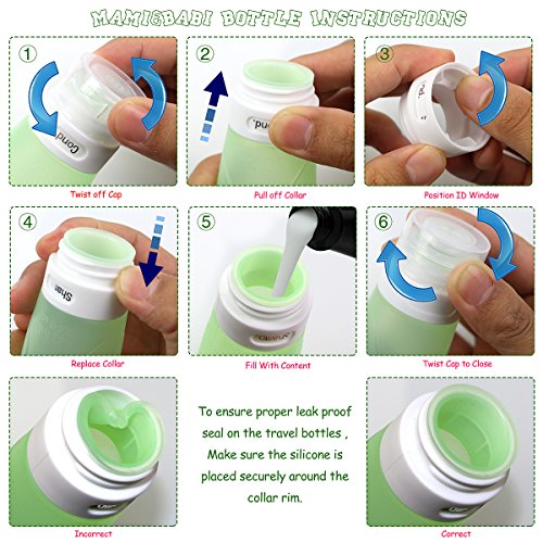 -. Title : Mami & Babi Silicone Travel Bottles Set, Refillable Cosmetic Containers, Squeezable Leakproof Reusable Travel Containers - Kitchen, Travel, and General Use - Stands UP.R.Ight for Honey, Sauces, Shampoo, Conditioner, Lotion, Toiletries