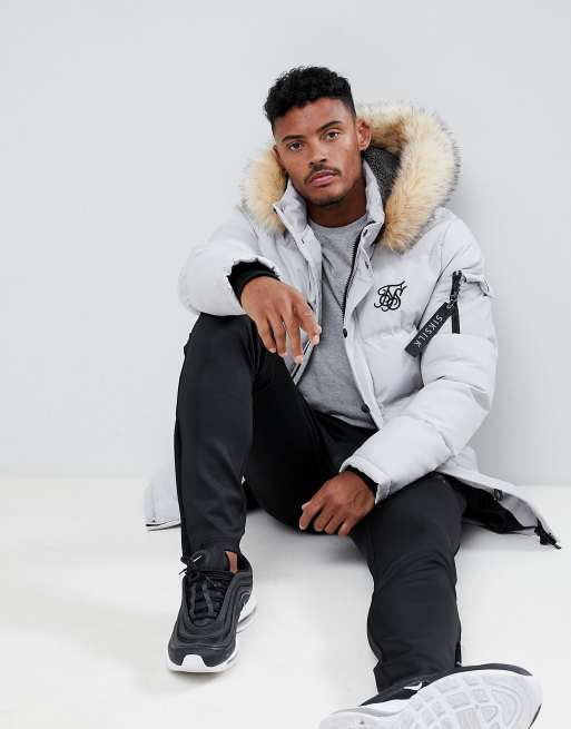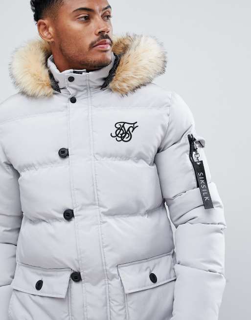 SikSilk parka jacket with fur hood in gray
