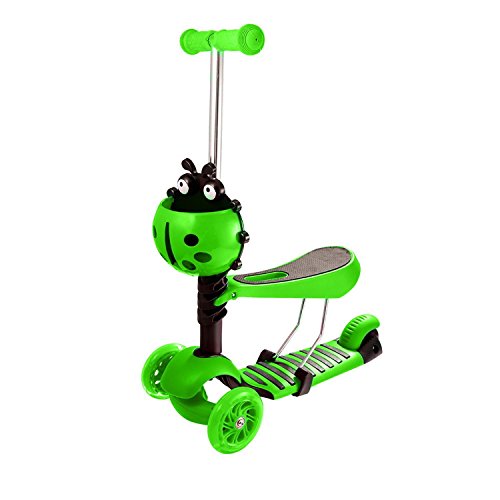 -. Feature : Material: Metal and Plastic. Soft rubber handlebar grips provide maximum comfort and soft enough to protect kid's hand and ensure more safety / There are 5 different ways for different ages. Baby toddler walker, kids stroller, sitting scooter, toddler kick scooter, kids kick scooter.If you buy this kick scooter, you can use different modesaccording to your baby's age and it will accompany with the child's whole early childhood / This scooter is easy to put together and without use any install tools. Two kinds of installation mode, two different riding methods.The seat and the handlebars can be easily removed from the deck. The scooter comes apart into pieces, making it easy to place in the car,take it to anywhere / Flash wheels Super-Cool at night,and it mark the position of children when kids play the scooter in envenning or dark enviroment.Unique 3 wheels kick and go design makes our scooters are stable and safe / Package Content : 1 x Kick Scooter,1 x Manual