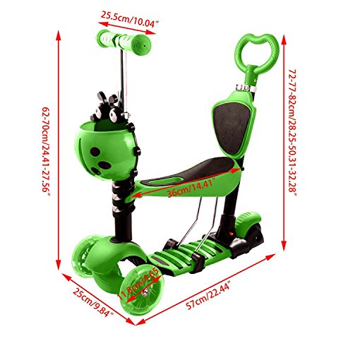 -. Title : (US Stock) Hindom Kids Toddler 5 in 1 Cute Cartoon Adjustable Height Kick Scooter with 3 LED Light Up Wheels and Removable Seat, Back Rest, Front Basket, Handlebar