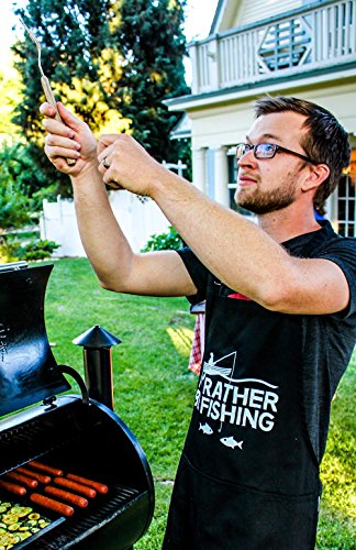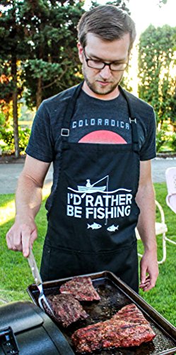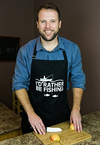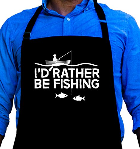 BBQ Grill Apron - I'd Rather Be Fishing - Funny Apron For Dad - 1 Size Fits All Chef Apron High Quality Poly/Cotton 4 Utility Pockets, Adjustable Neck and Extra Long Waist Ties