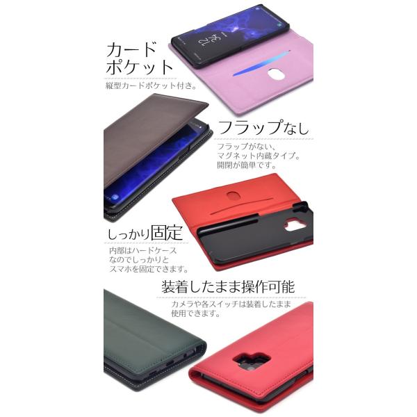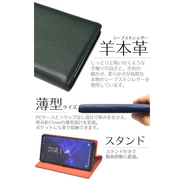 | 商品の説明 | 高級感あふれるシープスキンレザーを使用した、シープスキンレザー手帳型ケース。 しっとりと吸い付くような手触りの良さと、きめの細かさ、柔らかさが抜群な 本物のシープスキンレザーを使用しています。 背面を折り返すとスタンドとして使用できるので、動画視聴に便利です。 横開きタイプなので、手帳のように使うことができます。 また、内側には収納しやすい縦型のカードポケットが付いています。 フラップがない、マグネット内蔵タイプなので開閉が簡単です。 内部ケースはハードケースなのでしっかりとスマートフォンを固定できます。 PCケース採用とフラップなし設計で厚みをおさえ、 厚み約17mmの薄型サイズを実現。 ポケットにも楽々収納できます。 |