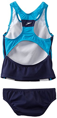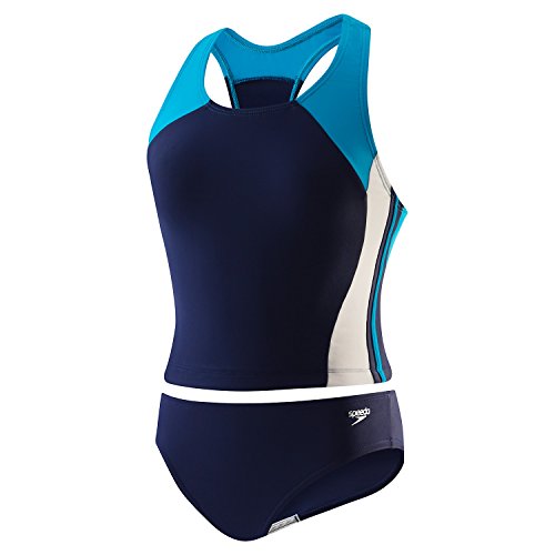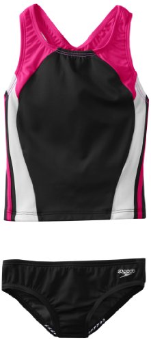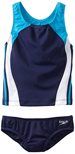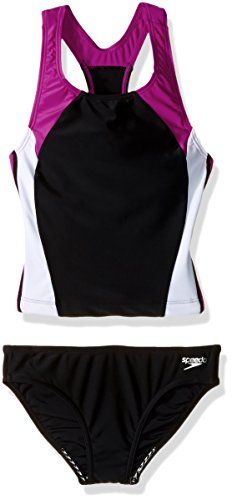 Speedo Youth Infinity Splice Tankini The Girl's Infinity Splice Tankini is a great 2 piece athletic style with thick racerback straps for a secure fit that won't bind or gap. But the bold team inspired colorblock splicing makes this suit as much about fashion as it is about function. The suit features trademarked Xtra Life lycra which lasts 5 to 10 times longer than traditional lycra. So no bag and sag, and it looks like new for longer. It also offers our new no wedgie worries technology, which adds a thin silicone gripper at the inner edge of the bottom to keep the suit in place during activities. Features: Material: 80% Nylon 20% Lycra Xtra life lycra fabric lasts 5 to 10 times longer Resists bagging, sagging, and the effects of suntan lotion, skin oils, and chlorine No wedgie worries silicone gripper at leg openings for stay put coverage Sporty thick strap racerback styling for an improved fit and secure comfort Hand WashulFeature