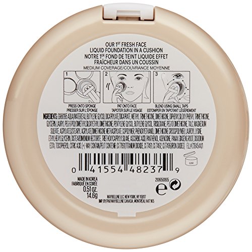 Maybelline's Dream Cushion foundation perfects and evens skin tone for a fresh-faced look, so everywhere you go you've got it covered. • Liquid foundation reinvented • Complete luminous coverage for all skin types • Available in a collection of fresh shades • Buildable medium to full coverage liquid foundation in a cushion format, perfect for on-the-go Step 1. Use the sponge applicator and press into cushion. Step 2. Tap the applicator onto the forehead, nose, cheeks, and chin. Step 3. Blend all over using gentle downward strokes in a tapping motion.Feature