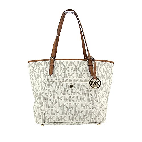-. Brand : Michael Kors -. ClothingSize : One Size -. Color : brown -. Department : womens -. Feature : MK Signature PVC; Trim: leather / No closure; Double top handles with 10" drop / Monogram print exterior; front snap pocket & logo medallion charm / Interior features middle zip compartment & zip pocket & 4 slip pockets and key hook / Approx. measurements 16" W x 11-1/2" H x 6" D -. Label : Michael Kors -. Manufacturer : Michael Kors -. Model : 30T4MTTT7B -. MPN : MKLJSLT6281510 -. PackageQuantity : 1 -. PartNumber : MKLJSLT6281510 -. ProductGroup : Shoes -. ProductTypeName : HANDBAG -. Publisher : Michael Kors -. Size : One Size -. Studio : Michael Kors -. Title : Michael Kors Jet Set Item Large Snap Pocket Tote in Vanilla PVC