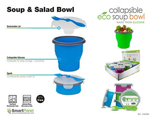 Studio : Smart Planet Publisher : Smart Planet Binding : Kitchen Product Description Makes lunch better than ever! Silicone Base is Microwave and Dishwasher Safe. Lid is not Microwave or Dishwasher Safe. Expands to Double the size, push down to collapse and store at half the size. Includes plastic lid and a reusable spork utensil that stores in the lid! Available in 4 fun colors! BPA Free. 0