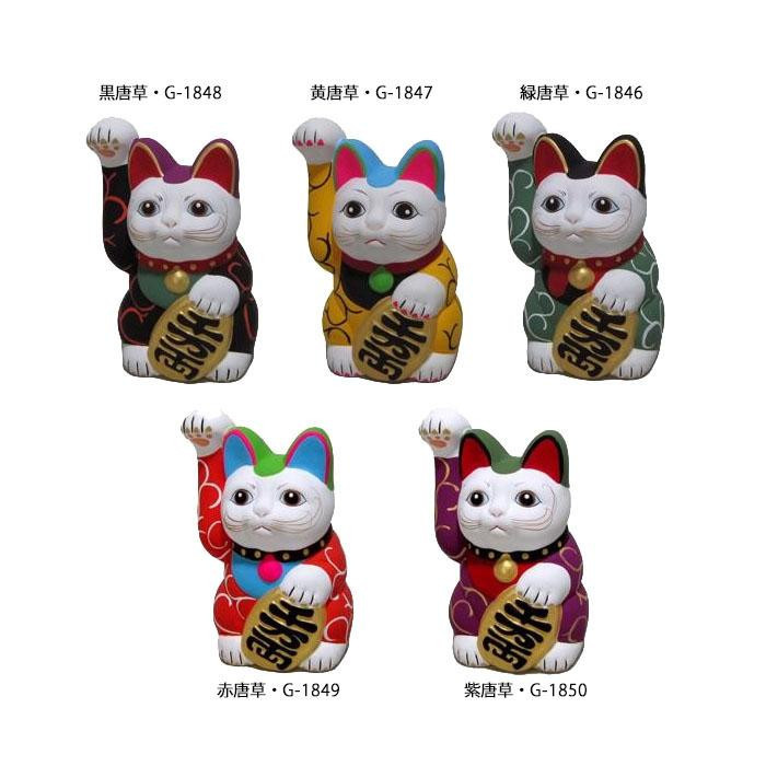 日本の伝統である「唐草模様」を昔ながらの招き猫に着せてみました!!手書きだから出来る職人の技です!!