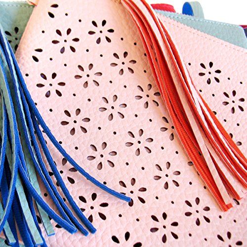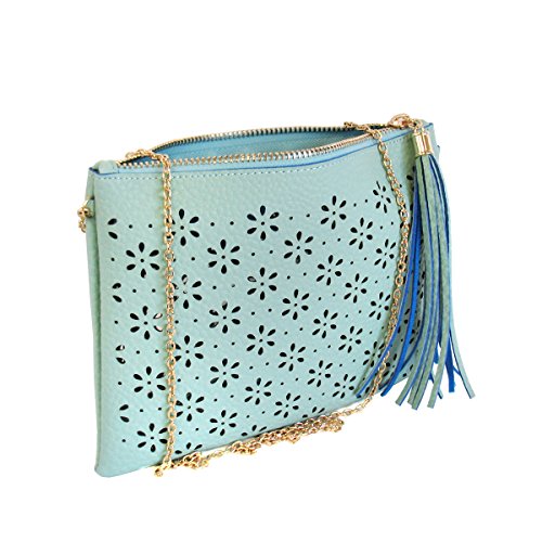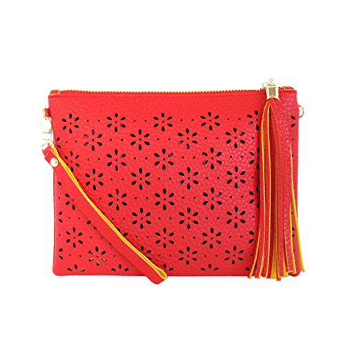 -. Brand : JNB -. Department : womens -. Feature : Daisy Pattern Laser-cut Seethrough Clutch / Comes with Detachable Wristlet / Comes with 21" drop optional cross-body chain. / Soft Faux Leather / Big enough to fit Cellphone, cosmetics and more -. ProductGroup : Shoes -. ProductTypeName : HANDBAG -. Title : JNB Women's Daisy Laser-cut Seethrough Tassel Clutch