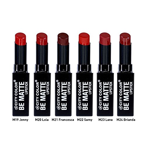 Feature : colors: M19 Jenny, M20 Lola, M21 Francesca, M22 Samy, M23 Lana, M24 Brianda / Rich with pigmentation and a matte finish, these lipsticks are touched with Vitamin E. to nourish your lips / Apply to lips for long-lasting matte pigmentation. For best results, prep with City Chic Lip Liner. / Net Wt: 0.105 oz. / 2.90 g / Package including 6 different color, one of each. 0.1 oz/ea.