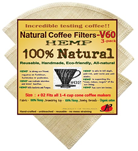 -. Feature : CONE SHAPE #02 : Comes 3 pieces all natural reusable coffee filters cone shaped, brew with more body than paper filters, but less sediment than metal mesh filters. Work Perfectly with 1-4 Cups Pour-over Coffee Brewers or Hario V60 02 Coffee Dripper or Tanors Ceramic Coffee Cone Dripper. / SAVE YOUR MONEY, SAVE THE PLANET and GO GREEN! : WITHOUT SHRINKING OR DEFORMING. Cost-effective alternative to paper filters. Cheap and ecologically with Long lasting and reusable - Wash out, drip dry, use again! Each filter should last you many years with proper care. / FULL TASTE : No PAPER TASTING is affecting your coffee taste. You will get the best tasting and lot smoother than drip coffee or pour over coffee that you only have to coffee filter once. The weave should tighten after a few uses and thus provide less porosity. RECOMMENDED MEDIUM TO FINE GRIND. / WHY'S 100%h.e.m.p FABRIC?--h.e.m.p has ZERO BIO TOXINS, requires no fertilizer,herbicides or pesticides like cotton. h.e.m.p kills BACTERIA, STAPH and FUNGUS. h.e.m.p is Anti-ROT, Anti-MOLD and Anti-STATIC. h.e.m.p can restrain microbes and bowel bacillus. h.e.m.p fibers are grown and produced without the use of the harmful chemicals. / NO HARMFUL CHEMICAL IN YOUR DRIP COFFEE ANYMORE!! PURE h.e.m.p UNDYED FABRIC - ORGANIC COTTON SEWING THREAD - NO GLUE - No Risk of Hormone Dysfunctions or Breast Cancer Like Nylon - No Hazardous Chemicals Like Cotton Fabric - No More Plastic and Other Chemicals! Almost all the plastic(nylon & polyester) are basically the same (materials) as the paint strainers. Even though none BPA Plastic has noxious chemicals such as those that replaced BPA that also are hormone disruptors. NO glue in our sewing process.