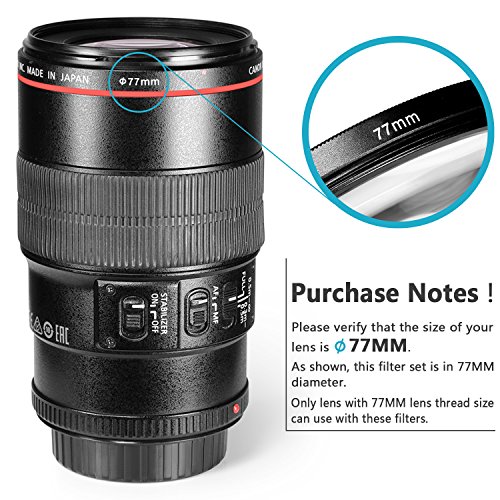 Note: 1.The Lens NOT INCLUDED 2.This neutral density filter set is compatible with all 77mm lenses. Please verify your camera's lens thread size before ordering.