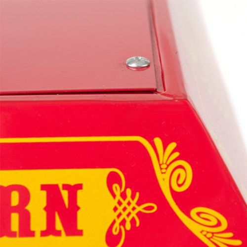 -. Feature : 600-watt popcorn machine with cart in red / All-metal construction with tempered side glass panels / Uses stainless steel hot oil kettle / Handy storage compartment in cart's base / Capacity: 4 oz.