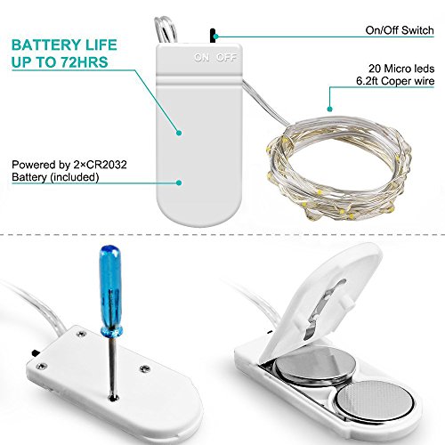 - Adorable 8 pcs string lights in one pack, each has 20 led on 7.2ft strings spacing 0.32ft, 2 x CR2032 included on/off switch easy to be replaced,easy to hide into your design works