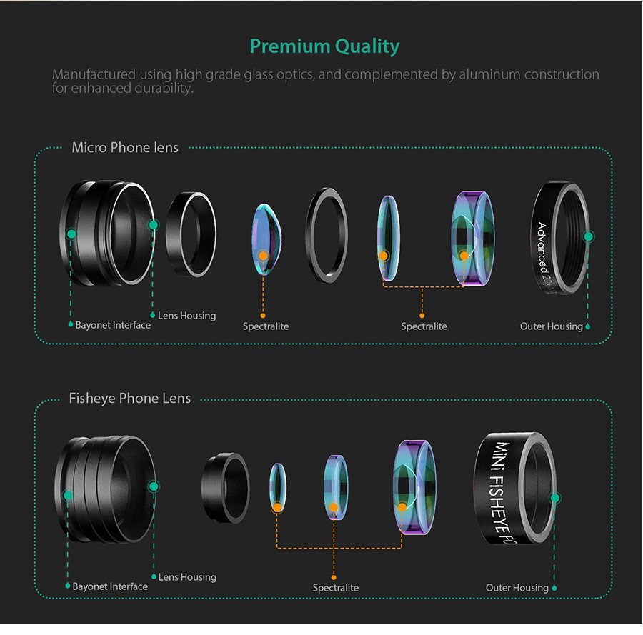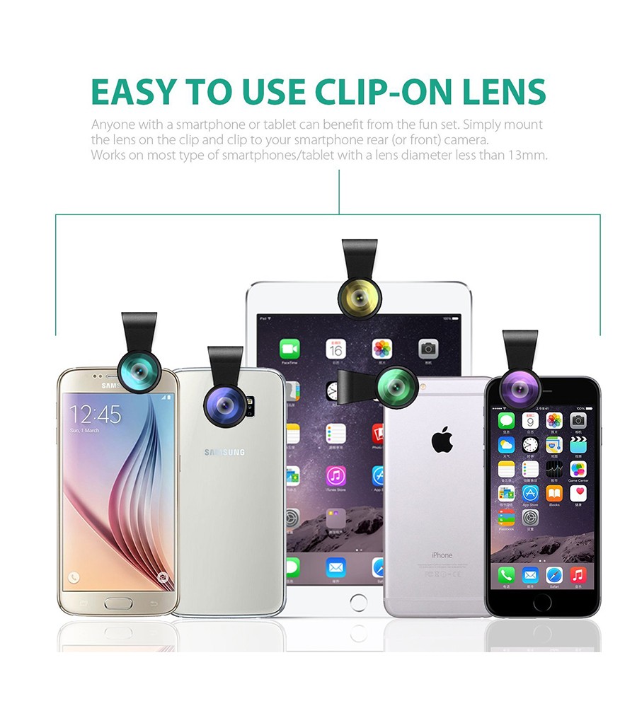 High performance, professional grade fisheye lens add-on instantly transforms the rear camera on your smartphone or tablet. Capture your world in an ultra-wide viewing field (160° angle) for the most incredible and dramatic rounded images. Uniquely suited for the ultimate in vibrant selfie shots. Also perfect for the most extreme skateboarding, parkour, snowboarding, sports, vacation and travel images and videos imaginable.