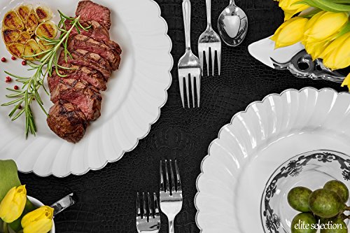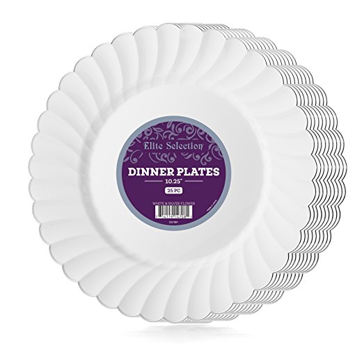Elite Selection Pack Of 25 White Dinner Disposable Party Plastic Plates With Silver Flower Rim 10.25-Inch
