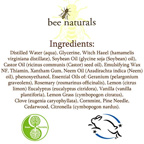 NATURAL INGREDIENTS SMELLS GREAT - Bee Naturals cleverly chose a blend of ten different essential oils to incorporate into their buy spray: Geranium, Rosemary, Lemon Eucalyptus, Vanilla, Lemon Grass, Clove, Cornmint, Pine Needle, Cedarwood, and Citronella. Unlike the toxic aroma of commercial bug sprays that leave you smelling like a chemical spill, this blend leaves you perfumed by the concentrated essence of flowers, fruits, herbs, and plants.