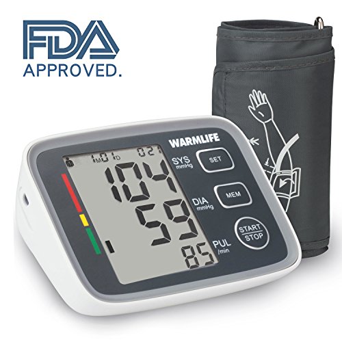 -. Binding : Health and Beauty -. Brand : WARMLIFE -. EAN : 0611801198362 -. Feature : ACCURATE MEASUREMENTS: FDA-registered, top-rated upper arm(max 12.6'') monitor, tested for trustworthy results. 2-YEAR WARRANTY. / Manage and track up to 180 readings on your blood pressure monitor / Multi-colored indicator lights clearly show how your reading compares to normal home blood pressure levels / Track your health with increased memory storage allowing you to monitor and store the last 180 readings for more than one person / Feel empowered by accuracy with technology that automatically displays the average of your last 3 readings taken within the last 10 minutes and detects irregular heartbeats -. IsAdultProduct : 0 -. Label : WARMLIFE -. Manufacturer : WARMLIFE -. MPN : U80EH -. PackageQuantity : 1 -. PartNumber : U80EH -. ProductGroup : Health and Beauty -. ProductTypeName : HEALTH_PERSONAL_CARE -. Publisher : WARMLIFE -. Studio : WARMLIFE -. Title : Warmlife Automatic Digital Upper Arm Blood Pressure Monitor with Cuff, FDA Approved (White with Black face) -. UPC : 611801198362