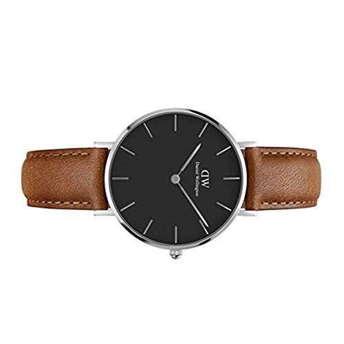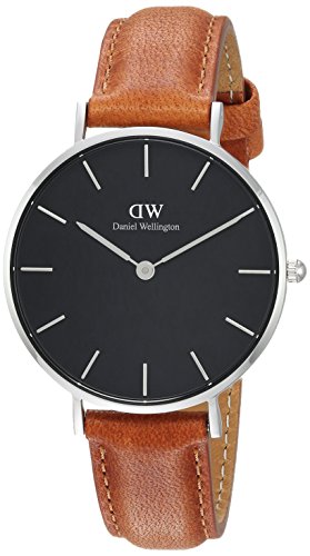 Stainless steel case with a brown leather strap. Fixed stainless steel bezel. Black dial with silver-tone hands and index hour markers. Minute markers around the outer rim. Dial Type: Analog. Quartz movement. Scratch resistant mineral crystal. Pull / push crown. Solid case back. Case size: 32 mm. Case thickness: 6 mm. Round case shape. Band width: 14 mm. Tang clasp. Water resistant at 30 meters / 100 feet. Functions: hour, minute. Additional Info: in general, withstands splashes or brief immersion in water, but not suitable for swimming or bathing. Casual watch style. Daniel Wellington Classic Petite Durham Ladies Watch DW00100178.Feature