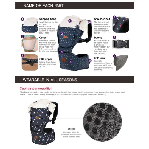 - Feature : Made and Design in Korea. Usually delivery time takes 7 to 10 days. / Can use the hip-seat solely or connect the hip-seat with the carrier to use it as a baby wrapper. / One time at the waist! One time at the shoulder! Wearable in all seasons. / High quality mateials which have been proven for their safety. / Item Spec : Hip Seat Carrier,Sleeping Hood and Organic Cotton teething Pads.