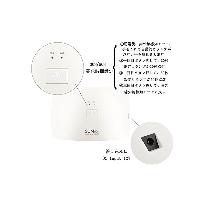 UV+LED이중 광원&타이머 기능:365+405nm의 최신인 더블 광원 기술을 채용하고, 어떤 젤도,레진액도,《샤》《기》#과 경화합니다.네일 젤을 빠르게 건조 시키는 것 를 할 수 있습니다.타이머 기능 첨부 와.30 초60초와 용도 에 맞게 하고의 사용이 가능합니다.장시간에 이용으로도 검게 되지 않는다.