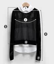 | 针织衫尺码 | ①衣长 | ②胸围 | ③肩宽 | ④袖长 | ⑤袖臂围 | ⑥下摆围 | ⑦袖口围 | ||