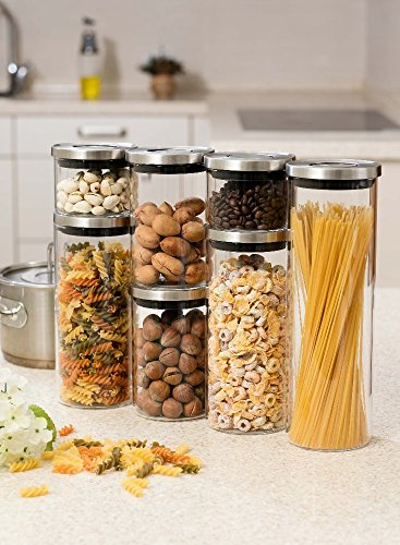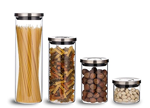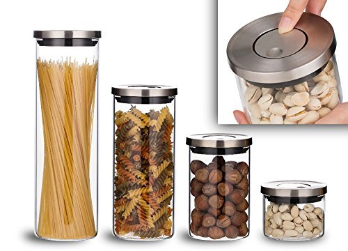 Airtight Glass Storage Container Set - One Button Seal - Set of 4 - Highest Quality, Stacking Borosilicate Jars, New Brushed Stainless Steel Lid by ELEMENTAL KITCHEN