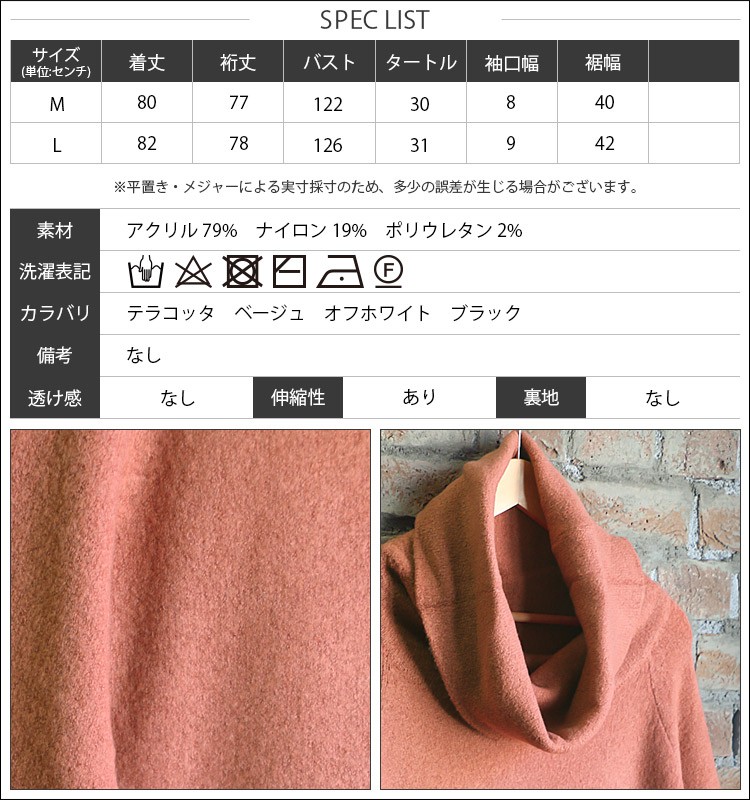 M:着丈 80cm 裄丈 77cm バスト 122cm タートル 30cm 袖口幅 8cm 裾幅 40cm