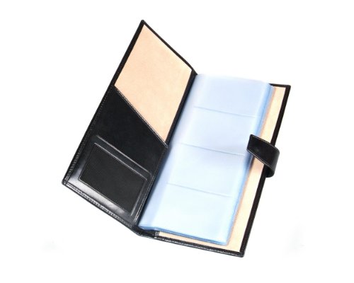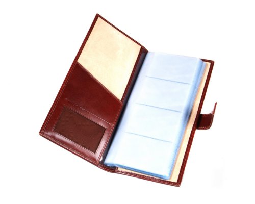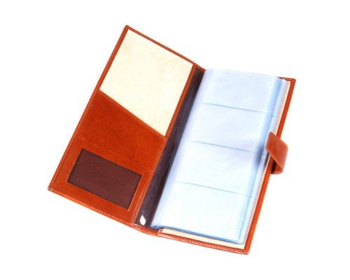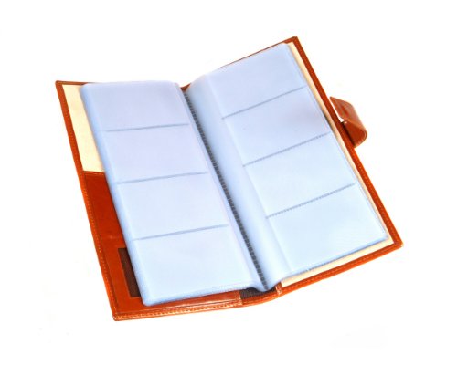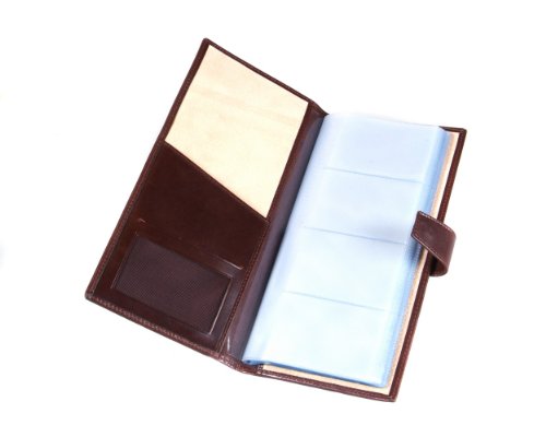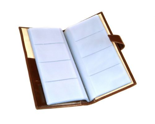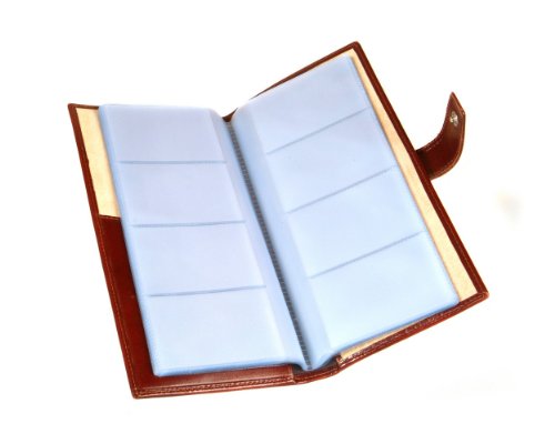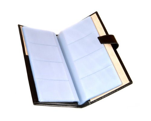 Studio : SageBrown Publisher : SageBrown Binding : Apparel Product Description Handmade in fine calf hide this SageBrown multiple business card holder is an impressive desk accessory to store all your essential business cards in one handy place.This slightly padded wallet is stylishly plain on the front and back and ideal for personalisation. It's secured with a tab and stud fastening and inside is luxuriously lined in ivory suede. On the left hand side is a shaped slip pocket that opens on 2 sides and a mesh ID window. Each of the 20 plastic sleeves holds between 4-8 cards or a total of 80-160 if doubled up. 0