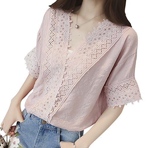 -. Title : (ガラーボ) GALARVO ブラウス シャツ レディース カットソー トップス エレガント オシャレ Vネック レース 刺繍 大きいサイズ ゆるふわ 半袖 ホワイト 白 ピンク S M L 2XL