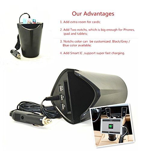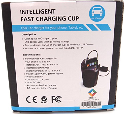 Multi-functional Car Charging Cup Holder - 3 Port USB Car Charger - Multifunction USB Car Charger / Phone-Tablet Stand / Card Slot When it's time to free up the clutter, and organize your car cup and dashboard section, this is the tool you need, this is the miracle that will make it all so easy, and save the situation. You don't need all the wiring and coin and card holders etc, this is the one gadget that fits it all And, you also get the notch on the sides of the cup to hold your tablet or smartphone to comfortably view your movies and emails while enjoying the neat car ride. Features: 1. Super Fast Charging up to 3 Digital Devices At The Same Time. 2. Credit Card,driving licence etc storage. 3. Mobile phone, coins, valuables etc storage. 4. Super Charger Approval , Save charging time. 5. Input :12-24V. 6. Output: DC 5v real 4.1A - 3Ports: 1A/1A/2.1A 7. Each USB port with Smart IC for Super Fast Charging. 8. Product Size:106x101x130mm. 9. Base Diameter:71mm. 10. Certificates : CE/ROHS/FCC Approval. . - A Brand You Can Trust YTR.co is a brand rooted in trust. We proudly stand by our products, and will always be there to back it up. When you buy a YTR.co product, you have the peace of mind knowing that you are getting your monies worth.