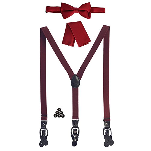 Studio : B-One Publisher : B-One Binding : Apparel Product Description Convertible suspenders, bow tie, and hanky set from Gioberti give an ultra-elegant look to your stylish boy! Y-back style suspenders with genuine leather crosspatch, leather button tabs with elastic. They are 1 inch wide, 43 inches long. Set includes 6 buttons, and silver metal finish adjusters, matching satin bow tie and handkerchief. It comes in an impressive gift box packaging. 0