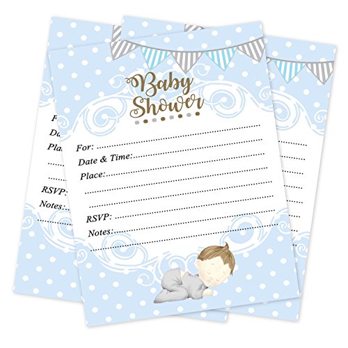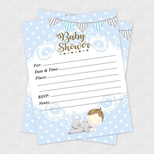 Studio : VIP Invitation Studio Publisher : VIP Invitation Studio Binding : Health and Beauty Product Description High-Quality Boy baby shower blue invitations (includes envelopes).?Printed on 120# weight cardstock and measure 5.5x4.25 inches. These invitations have a smooth, matte finish so you can use any pen with plenty of lines to write in your?wording. Flat, non-folding and are professionally printed. I ensure the quality of each card - yes -?I actually examine EACH invitation that is printed! Blank on the back. Colors are vibrant and NOT faded! These affordable shower invitations also include envelopes for mailing. 0