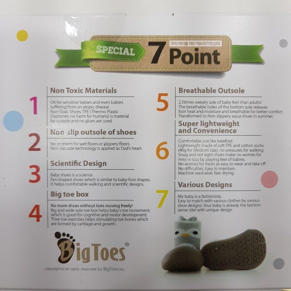 1.독성물질없는 안전한재료2.미끌링방지공법적용3.아가들발모양과 같은 부채꼴모양으로 만들어 걸음마 편하게 만든 과학적인 디자인4.자유로운 발가락의 움직임을 위하여 발가락부분은 편하게 디자인5.밑창의 미세한구멍으로 통풍이 우수한 신발.아쿠아 슈즈로도 신길수있습니다.6.탈착시 편하게, 맨발같은 상태의 편안함 추구. 기계세탁가능.7. 독특한 디자인으로 신을 신는순간 제일 멋진 아가가 될것입니다.